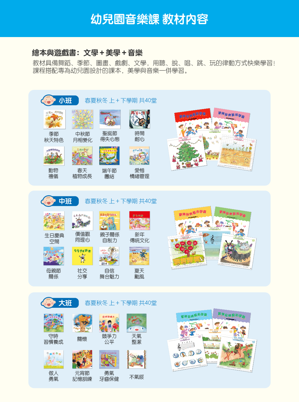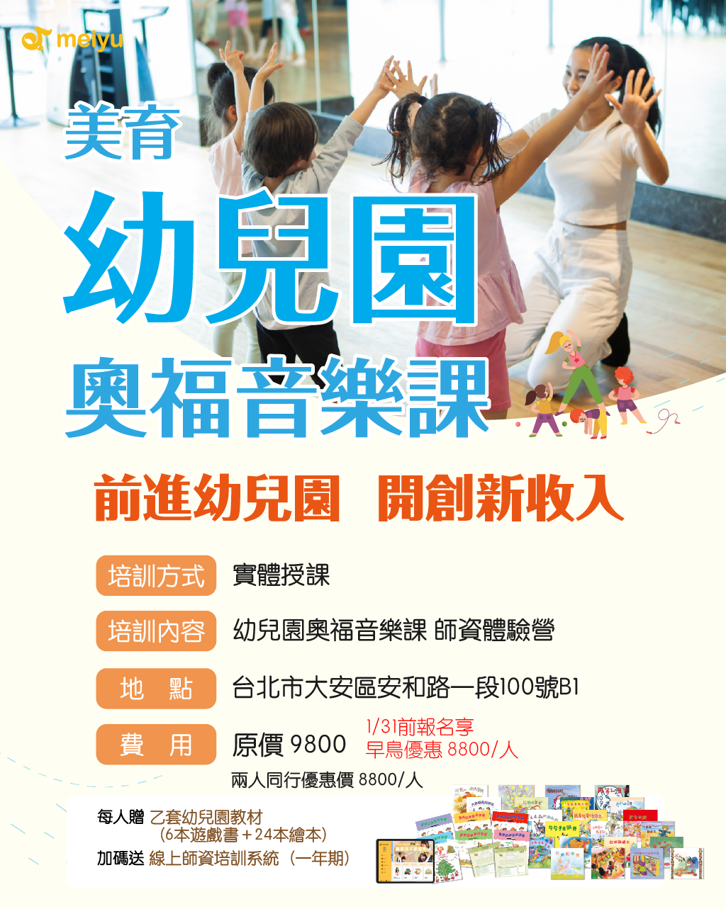 參加實體體驗營者將獲得幼兒園體驗營教材乙套與美育線上師資培訓系統一年期。